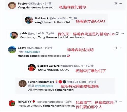 其中開拓者官方就直接發(fā)文表現(xiàn)楊瀚森太瘋狂了。還有媒體表示:楊瀚森打球就像小女孩一樣轉(zhuǎn)圈跳來跳去,好久沒有對開拓者隊如此興奮了,我看得夠多了,楊瀚森就是我們需要的那個人。當(dāng)然了,美國網(wǎng)友說的更甚,有網(wǎng)友評論道:“楊瀚森將是最佳新秀”?!拔业奶欤瑮铄喼笔羌s基奇plus”,甚至還有球迷表示楊瀚森才是GOAT。對于楊瀚森的表現(xiàn)和未來前景,大家怎么看呢?